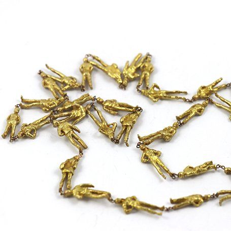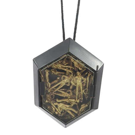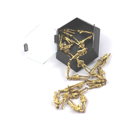 Partindo da ideia de relicário como objeto com a função de guardar as relíquias, retratos ou cabelos de pessoas amadas, e retirando-lhe a importância de "jóia", valorizando o conteúdo, proponho uma homenagem a todos os homens e mulheres que naquele momento da história da Humanidade deram a vida a trabalhar nas minas de ouro e pedras preciosas. A minha homenagem é materializada através de uma corrente com 30 figuras humanas em ouro. Esta corrente será inserida numa pequena caixa pendente com uma forma hexagonal, de lados inclinados, remetendo para o talhe de lapidação das pedras preciosas.